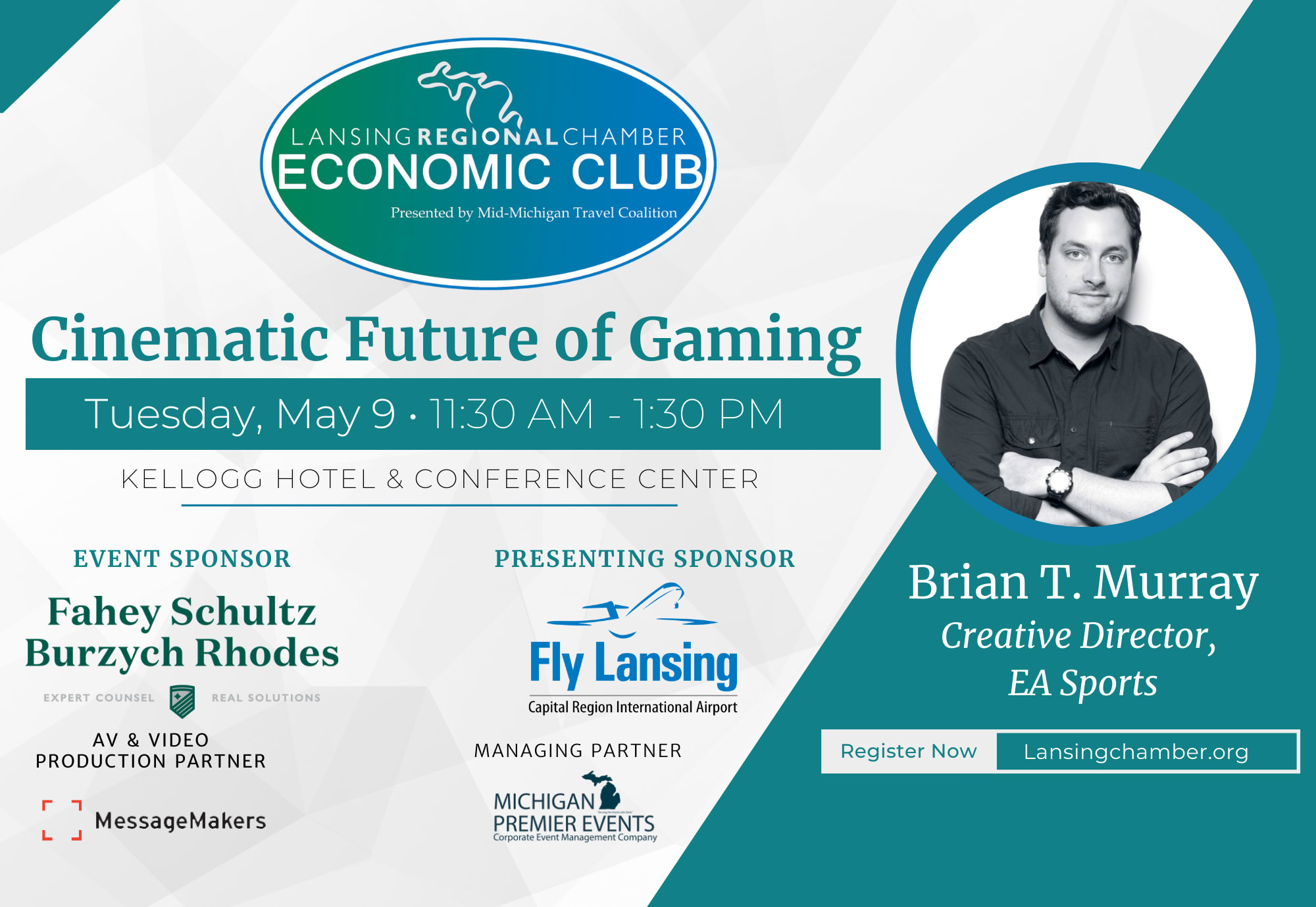 The upcoming Lansing Economic Club luncheon will welcome Brian Murray, creative director for EA Sports! Murray is a multiple Emmy and Cannes Lion award-winning Director of Photography with more than 17 years of cinematic experience. He filmed HBO’s hit show “Hard Knocks,” for which he won an Emmy for Best Cinematography. He also was Director of Photography for ESPN’s “30 for 30,” Funny or Die’s “Between Two Ferns,” and Pepsi’s “Uncle Drew.”