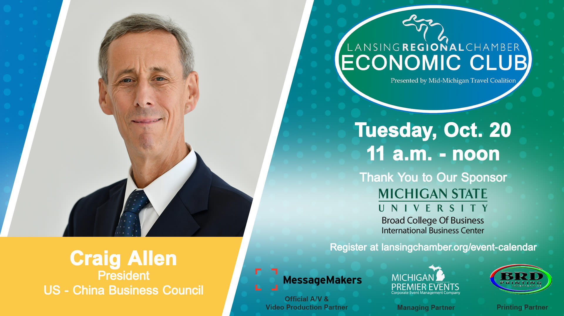 2.4 million jobs in the United States are dependent upon trade with China. Michigan exports make up roughly 30,000 of those jobs. As one of the most globally connected states, this is important. Sponsored by the MSU International Business Center, the Oct. 20 Lansing Economic Club will feature Craig Allen, president, US-China Business Council. Allen will discuss the future of the relationship between the U.S. and China, how the largest U.S. firms are working in China to build strategies to move forward, and the effects of “decoupling” the two economies. The virtual event will be held from 11 a.m. to noon.