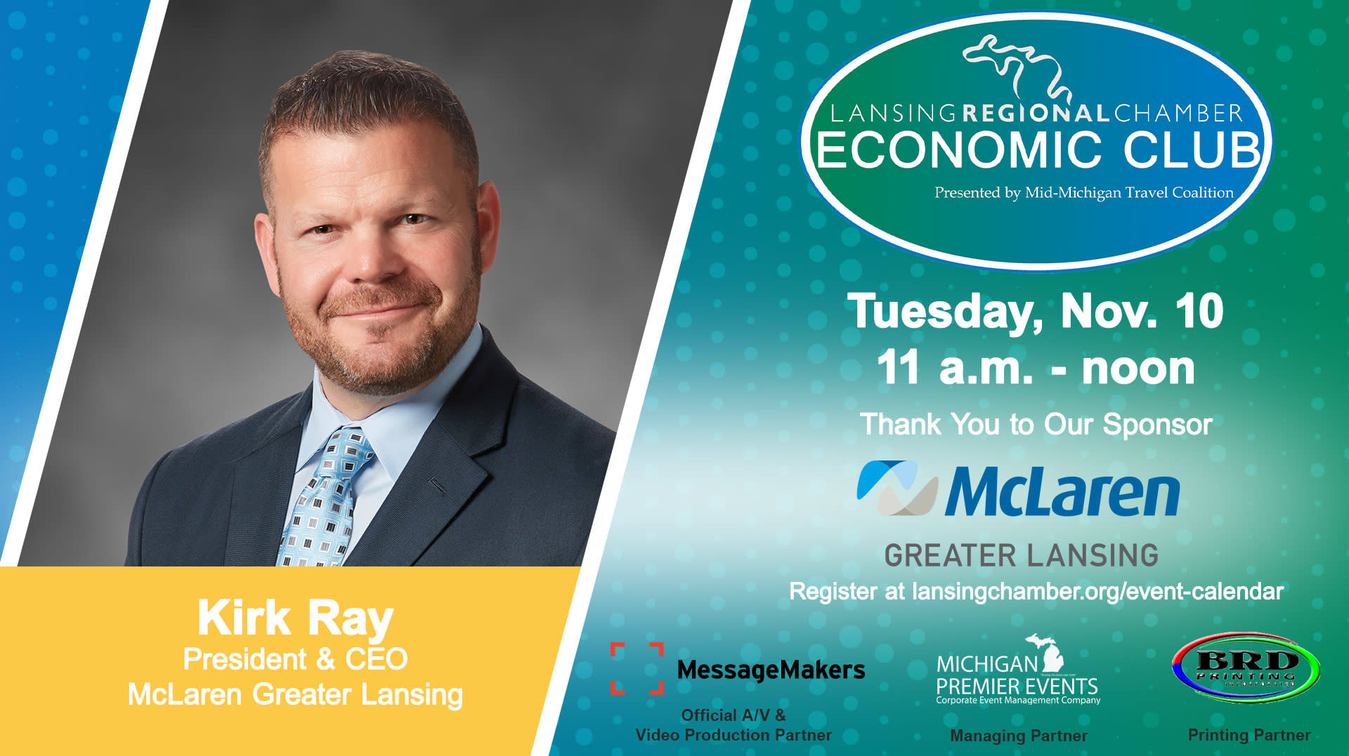 Sponsored by McLaren Greater Lansing, the Nov. 10 Lansing Economic Club will feature Kirk Ray, president and CEO, McLaren Greater Lansing discuss redesigning healthcare, technology, partnerships, and innovation. The event will be held virtually from 11 a.m. to noon.