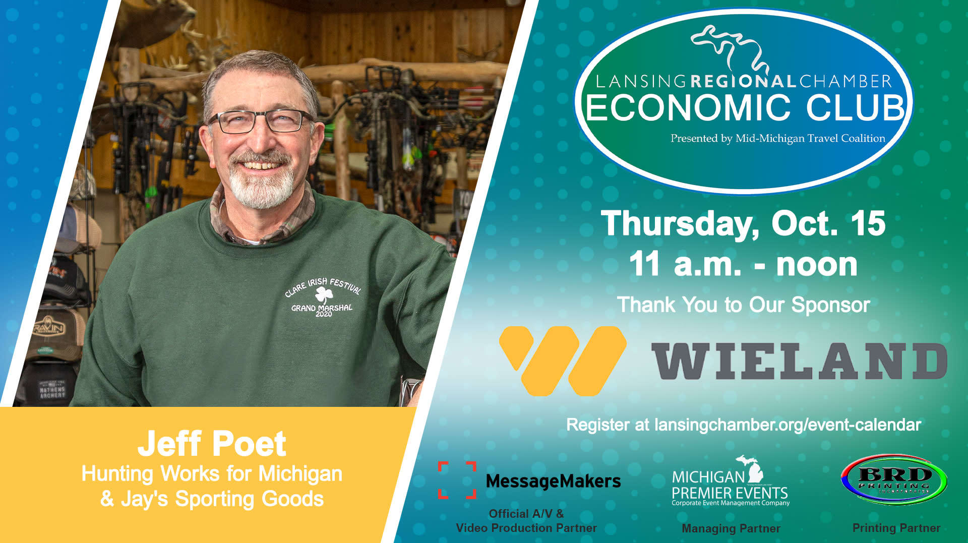 Sponsored by Wieland, the Oct. 15 Lansing Economic Club will feature Jeff Poet, president of Jay's Sporting Goods. Poet will discuss the impact hunting has on Michigan from a retailer's point of view and the economic statistics of the contribution hunting has on the state. The event will be held virtually from 11 a.m. to noon.