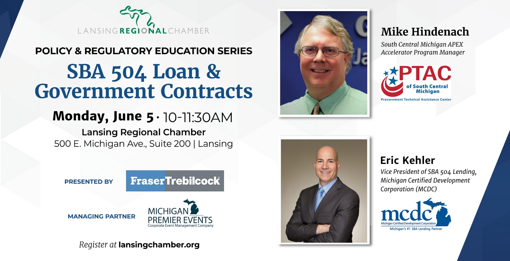 During this two-presentation dynamic program, you will learn about SBA 504 Loan by Michigan Certified Development Corporation (MCDC) and Government Contracts by APEX (formerly known as PTAC Procurement Technical Assistance Centers).